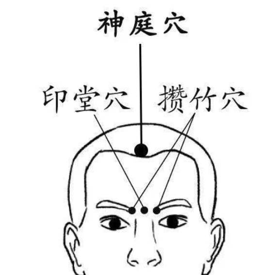取穴:印堂穴,在两眉头中间;神庭穴,在前发际正中直上0.5寸处。