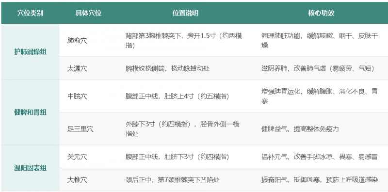 根据秋季养生重点(护肺、健脾、温阳),推荐以下几组穴位,可根据自身症状选择搭配: