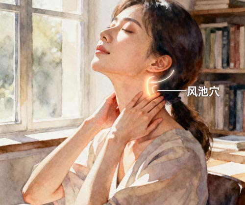 风池穴自古便是舒缓头颈的关键。《针灸大成》载其“主中风偏枯,头痛项强”。长时间用眼后,以拇指按压此穴3分钟,能迅速缓解头晕、眼疲劳,让人神清气爽。适合作为工作间隙的“充电”动作。