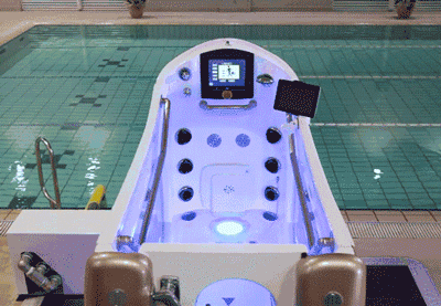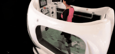 而底部带有一个可调速的传送带,最高时速可达 11km/h,并装有装有水泡喷射器,在跑步时可持续放出水泡,一来可以增加在水中跑步时的运动阻力,二来还可对肌肉、关节进行按摩等作用。。。